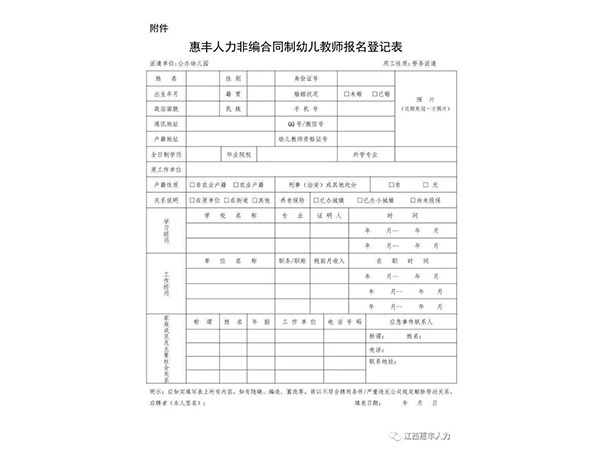 為滿足我市公辦幼兒園師資需求,我公司面向社會公開招聘一大批非事業編合同制幼兒教師,以勞務派遣的方式與用人單位進行勞動力資源開發合作?,F將有關事項公告如下:一、招聘人數及崗位我市招聘非事業編合同制幼兒教師50名,具體崗位在選崗前公示。二、招聘方式通過第三方勞務公...